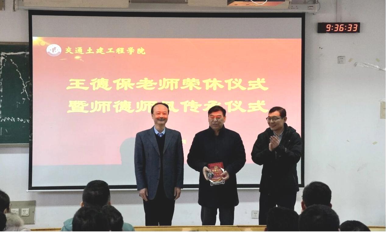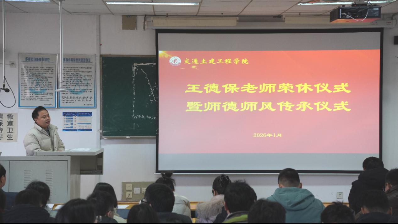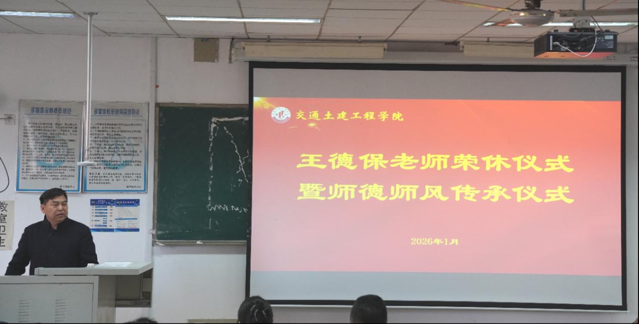 2026年1月12日上午,交通地理学院和交通土建工程学院在土木楼AB301为王德保老师举办荣休仪式暨师德师风传承仪式。学院党委书记朱鸿义、党委副书记李进娟,交通土建工程学院党委书记孙照波、副院长李志鹏、党委副书记田家军、副院长王琨出席仪式。仪式由交通土建工程学院副院长李志鹏主持。